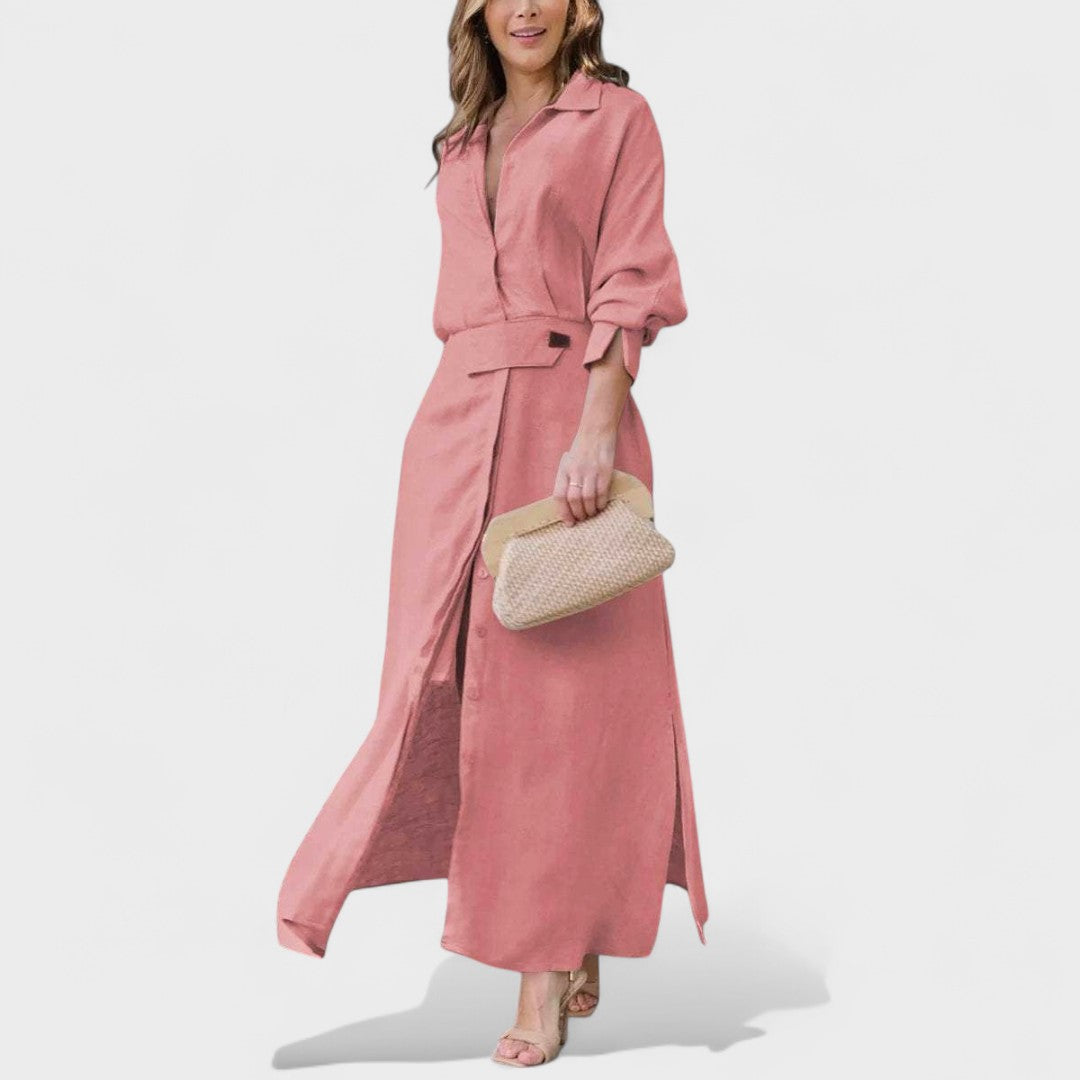 Тази макси рокля излъчва изтънченост и простота, предоставяйки елегантен вид за всеки повод. С женствен силует и детайли, които ласкаят фигурата, е перфектен избор за дневни и вечерни комбинации. Удобна и модерна, подчертава естествената красота с нотка на sophistication.