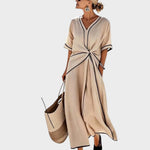 Тази дълга, ефирна рокля е перфектната комбинация от удобство и женствена елегантност. С модерен V-образен деколте, дискретен черен кант и стилна връзка в талията, подчертава фигурата и добавя изискан детайл. Идеална е за летни разходки, почивка край морето или неформални вечерни излизания.