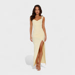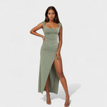 Роклята Констанца прекроява сложността със своя драпирано деколте и открит гръб с панделка. С тясна силуета, която удължава фигурата и страничен разрез за свобода на движение, тя е идеална за специални събития, на които искате да блеснете.
