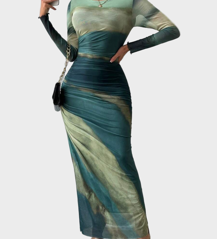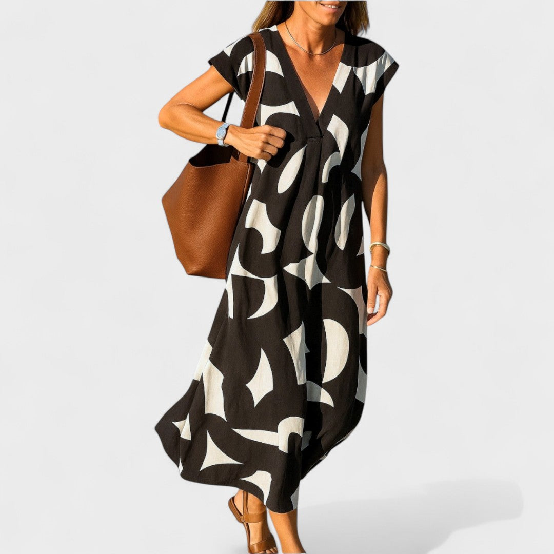 Ранка - Цветна миди рокля с ръкави тип пъф и V-образно деколте