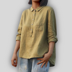 Класическа линена блузка, която излъчва дискретна елегантност и ежедневен комфорт. Има класически яка с копчета отпред и практичен джоб на гърдите. Свободният крой и дългите ръкави с възможност за повдигане я правят идеална за всеки час от деня.