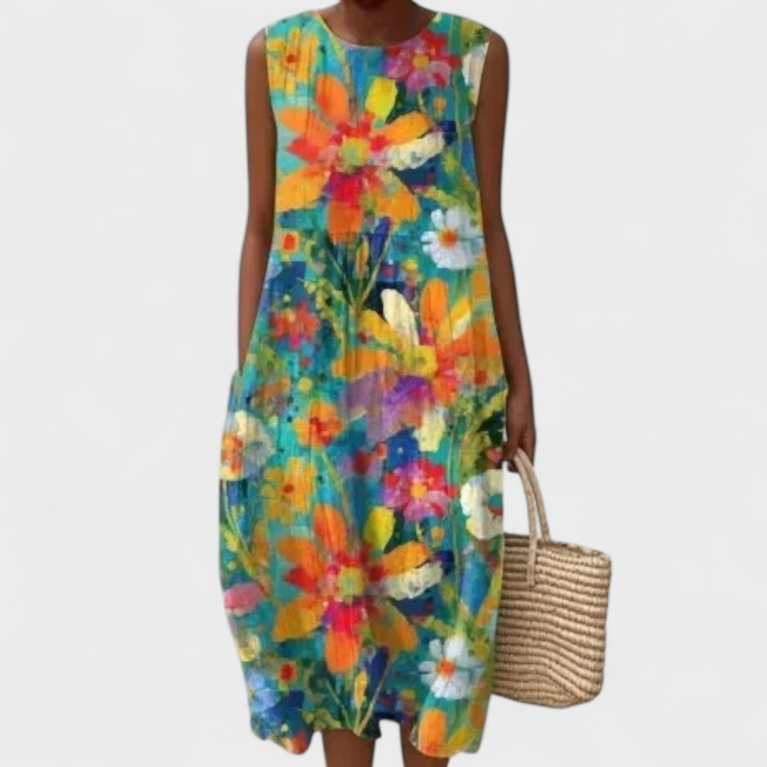 Тази лека и въздушна рокля перфектно съчетава стил и практичност, давайки ви свобода на движение и изискан вид за всякакви поводи. Нейният свободен крой и цветен десен я правят идеален избор за плажа, разходка из града или летни срещи.