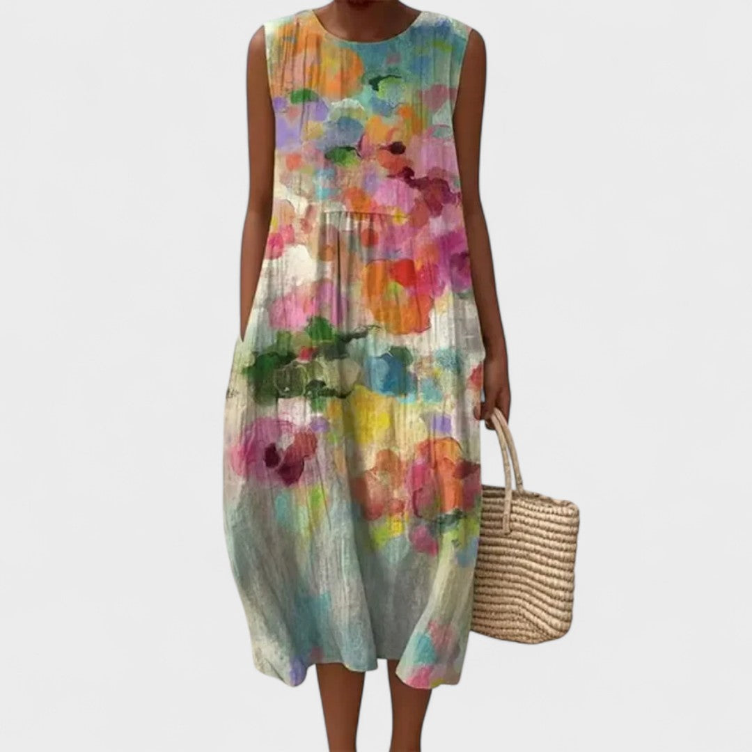 Тази лека и въздушна рокля перфектно съчетава стил и практичност, давайки ви свобода на движение и изискан вид за всички поводи. Нейният свободен крой и цветен десен я правят идеален избор за плажа, разходка из града или летни срещи.