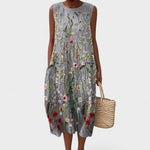 Тази лека и въздушна рокля перфектно съчетава стил и практичност, давайки ви свобода на движение и изискан вид при всякакви поводи. Нейният свободен крой и цветен десен я правят идеален избор за плажа, разходка из града или летни срещи.