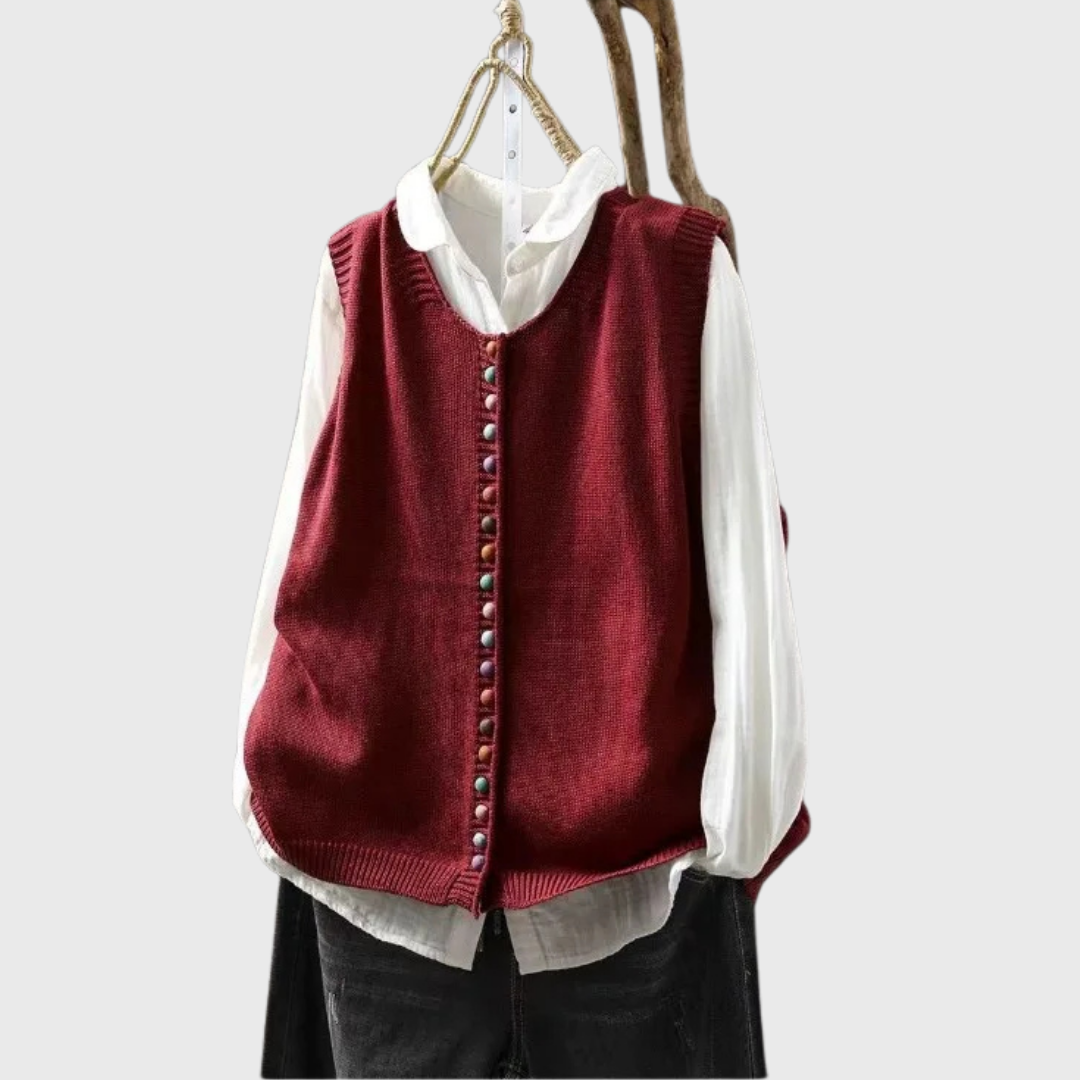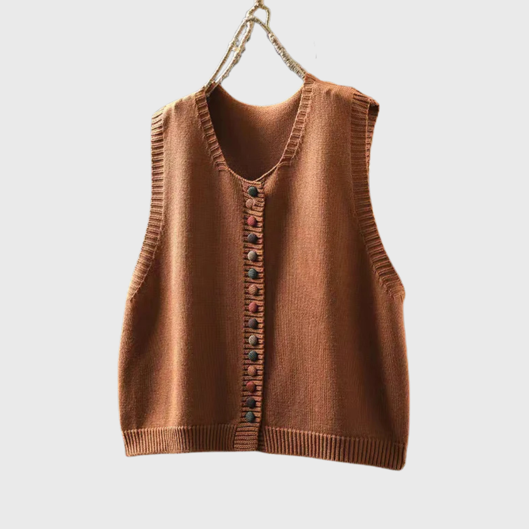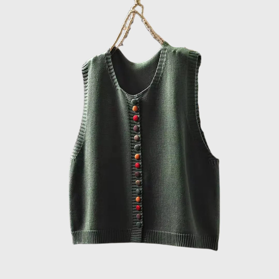 Добавете щрих на стил и оригиналност към визията си с този очарователен елек! Универсалният дизайн се съчетава перфектно с ризи, блузи и рокли, създавайки модерни и изпълнени с индивидуалност комбинации. Акцентът е редицата от различни копчета, които придават ръчно изработен чар и автентична визия. Идеален е за онези, които търсят непринудена елегантност и комфорт при всякакъв повод.