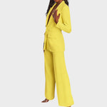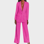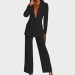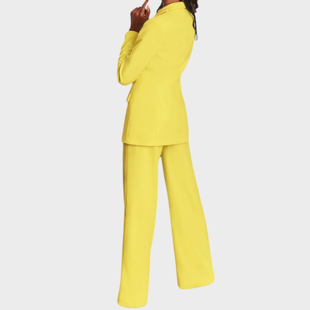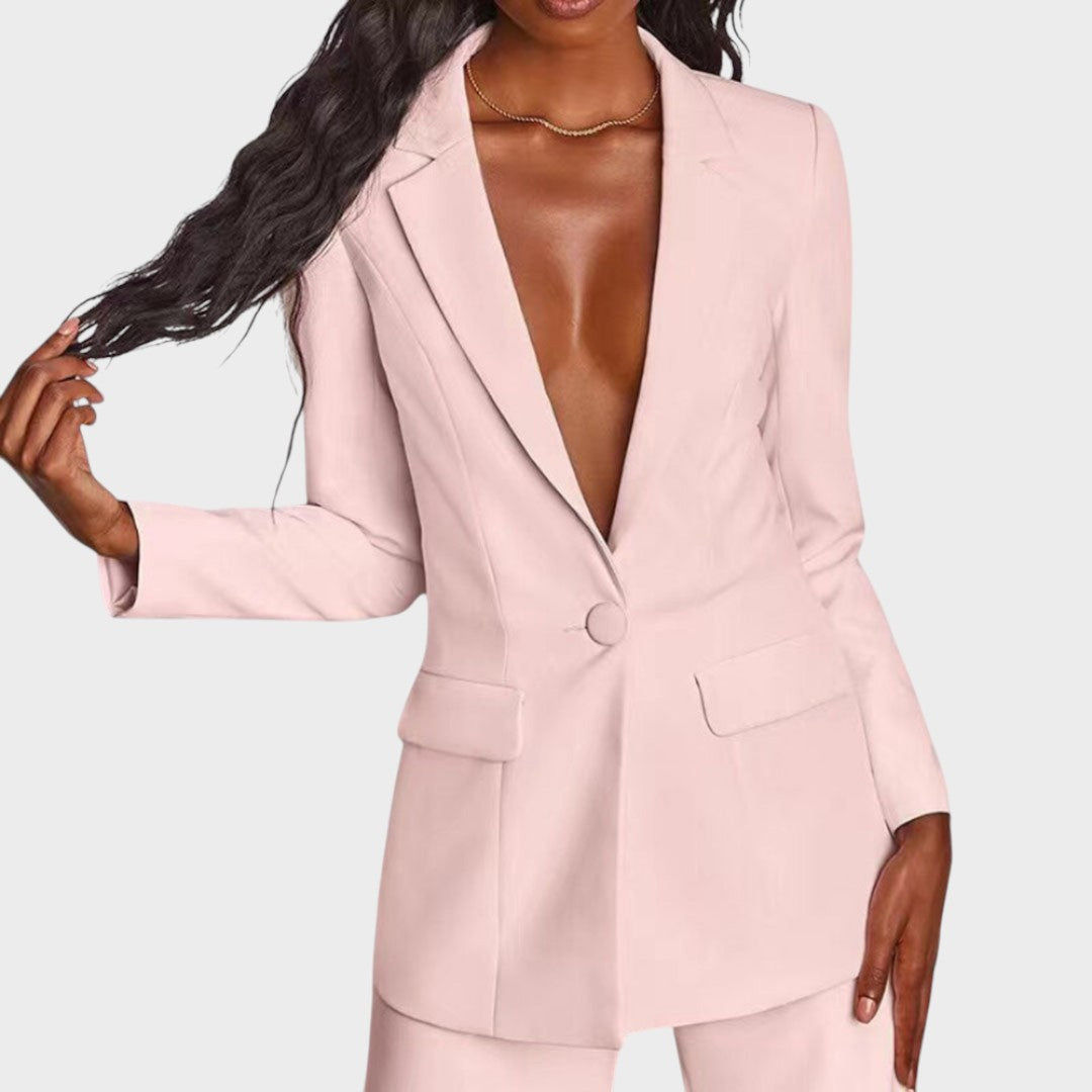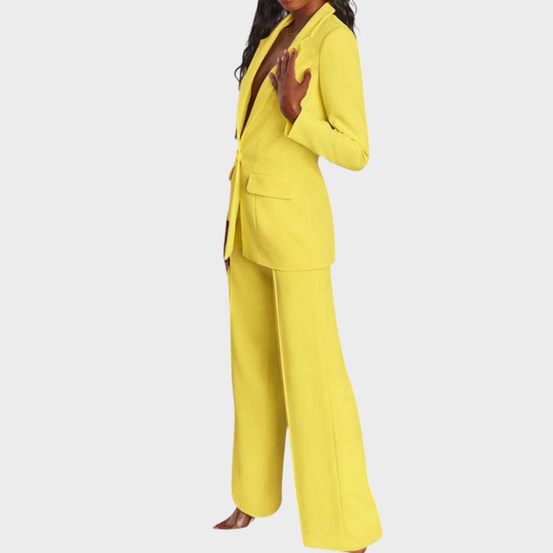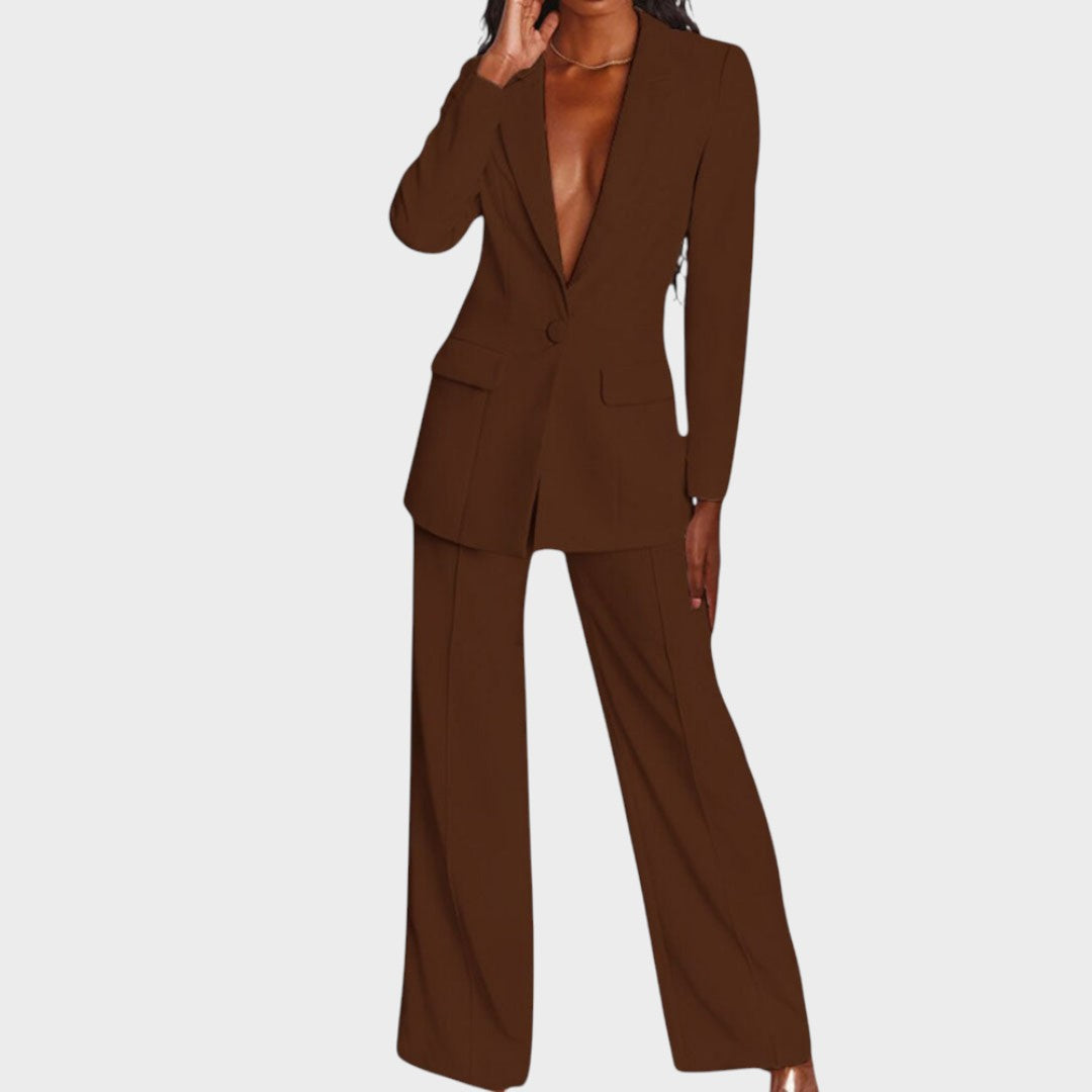 Дамски костюм, който съчетава изтънченост и модерен стил. Дългото сако с остри ревери, закопчаване с един копчета и джобове с капак красиво определя талията и визуално удължава фигурата. Панталоните са прави, с леко широки крачоли и гладка линия, осигуряваща чист, удължен профил и свобода на движение. Тъканта с красив драпиране предлага комфорт от сутрешната среща до вечерния излаз. Може да се носи като комплект или отделно – еднакво силно в офиса, на събитие или за официална вечеря.