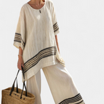 Спокоен стил с вечен морски усет. Комплектът Дейзи привлича вниманието с комбинацията от контрастни черни линии и естествен фон, предизвиквайки релаксирана елегантност. Просторната силуета и леката материя го правят перфектен спътник за топли климатични условия и бавни дни.