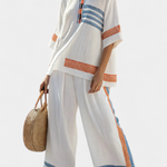 Структурирана свежест с морско усещане. Комплектът Daisy се отличава със своя чист и модерен дизайн, обогатен с ръчно изработени детайли в ярки цветове. Широката тениска и панталоните с широки крачоли създават разкрепостена силуета, която предава лекота и стил с индивидуалност.