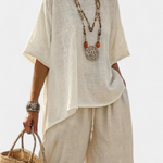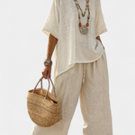 Цялостен минималистичен Daisy в естествени нюанси с oversized тениска и широки панталони за прост и елегантен стил