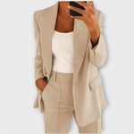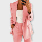 Женският одевен комплект Christina™ е изработен от висококачествени материали и предлага перфектна комбинация от комфорт и изискан стил. Класическият крой с сако и панталони осигурява елегантен вид, който лесно се адаптира към бизнес, официални и ежедневни поводи.