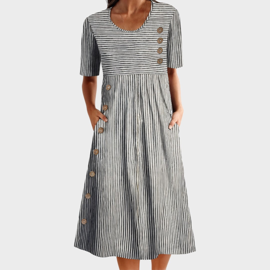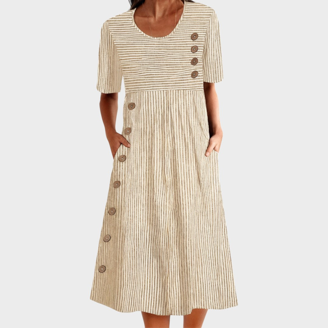 Това платье от висококачествен памук предлага перфектна комбинация от елегантност и комфорт. С женствен силует, практични джобове и детайли с копчета, лесно се вписва в дневни и вечерни поводи. Идеално е за тези, които искат да изглеждат стилно, а да се чувстват удобно.