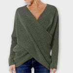 ✔️ Елегантно V-образно деколте: Модерно преклопно V-образно деколте и асиметричен подгъв придават специален щрих на този пуловер.