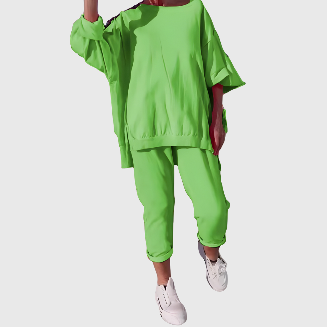Този комплект предлага перфектна комбинация от лежерен дизайн и практичен комфорт. Горната част с широк крой и панталони с прави линии осигуряват свобода на движение, докато модерен вид ви прави готови както за домашен отдих, така и за неформални излизания в града. Перфектното решение за тези, които искат да изглеждат модерно, а да се чувстват напълно отпуснати.