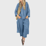 Този комплект от лек лен е перфектният избор за жени, които обичат комбинацията от елегантност и небрежност. Състои се от широки панталони, удобна блуза и дълго леко палто, което придава изисканост на ежедневния вид. Дишащият материал осигурява лекота при носене, а универсалният дизайн го прави идеален както за града, така и за почивка.