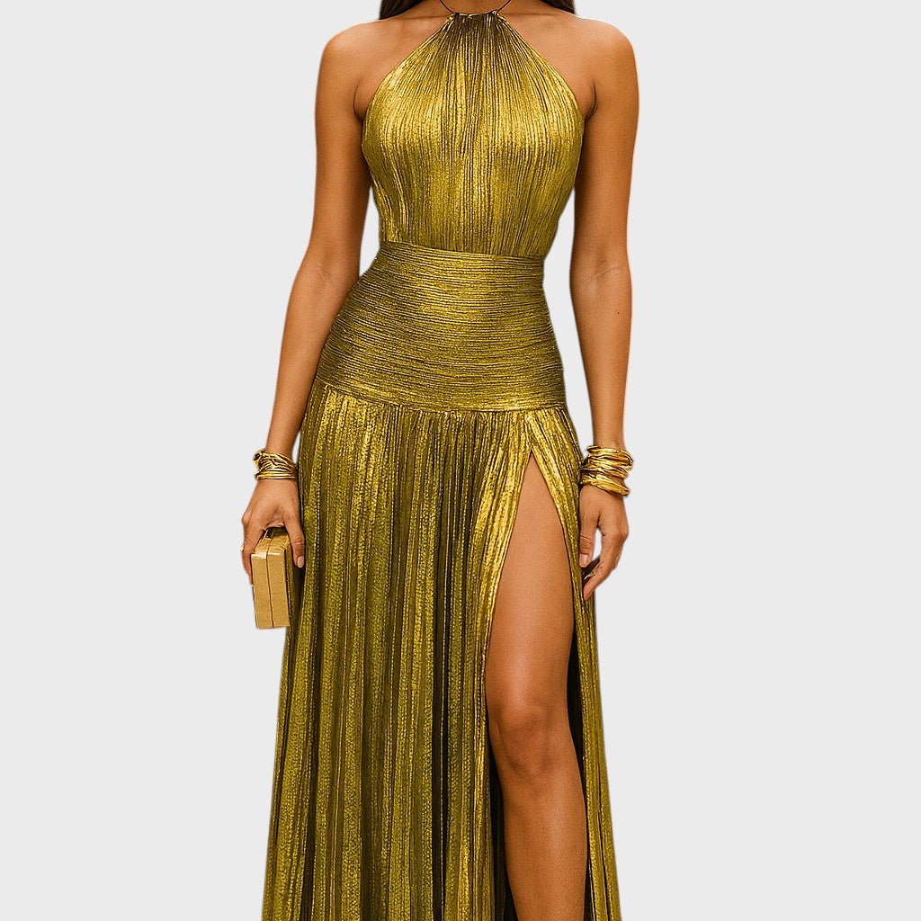 Вилма Дълга Рокля от Златен Бархет с V-Изрез