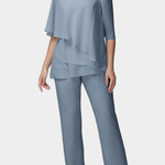 Софистицирана елегантност с разкрепостена структура. Комплектът Лана съчетава безръкавен топ с широк деколте и панталони с висока талия и летящи крачоли, създавайки изтънчен и удобен силует. Неговият въздушен и лек материал го прави идеален избор за деликатен и самоуверен вид.
