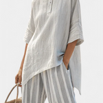 Спокоен стил с модерни линии. Комплект Дейзи комбинира асиметрична блуза с разкроена силуета и райе панталони в неутрални тонове, създавайки балансиран, свеж и елегантен вид за топли климатични условия.