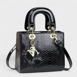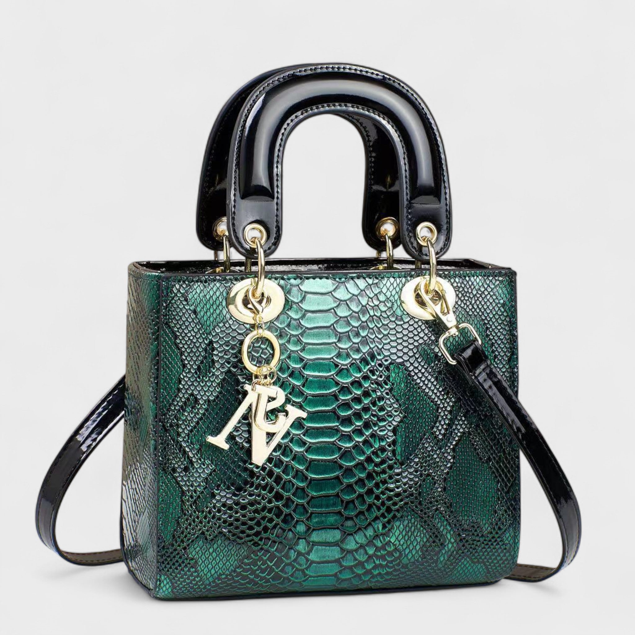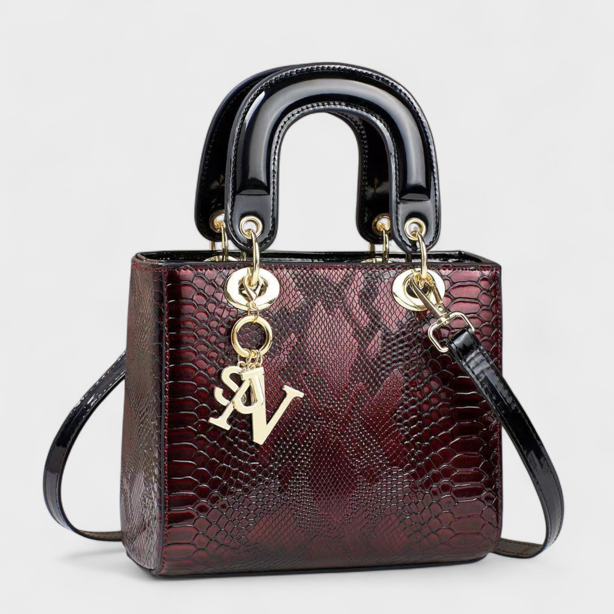 Със сложен завършек в животинска текстура и метални части с висок блясък, тази чанта е дефиниция на изисканост. Структурирана, с двойни дръжки и дълга сваляща се лента, предлага универсалност, която отговаря на формални събития до неформални моменти със стил. Аксесоар, който веднага повдига всяка комбинация, носейки чар и авторитет.