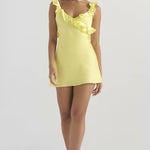 Игрива и женствена мини рокля, която комбинира елегантност и свежест. Асиметричният детайл с волани на деколтето придава специална динамика и стил, докато тесният крой подчертава силуета по най-привлекателния начин. Идеална за летни вечери и елегантни излизания.